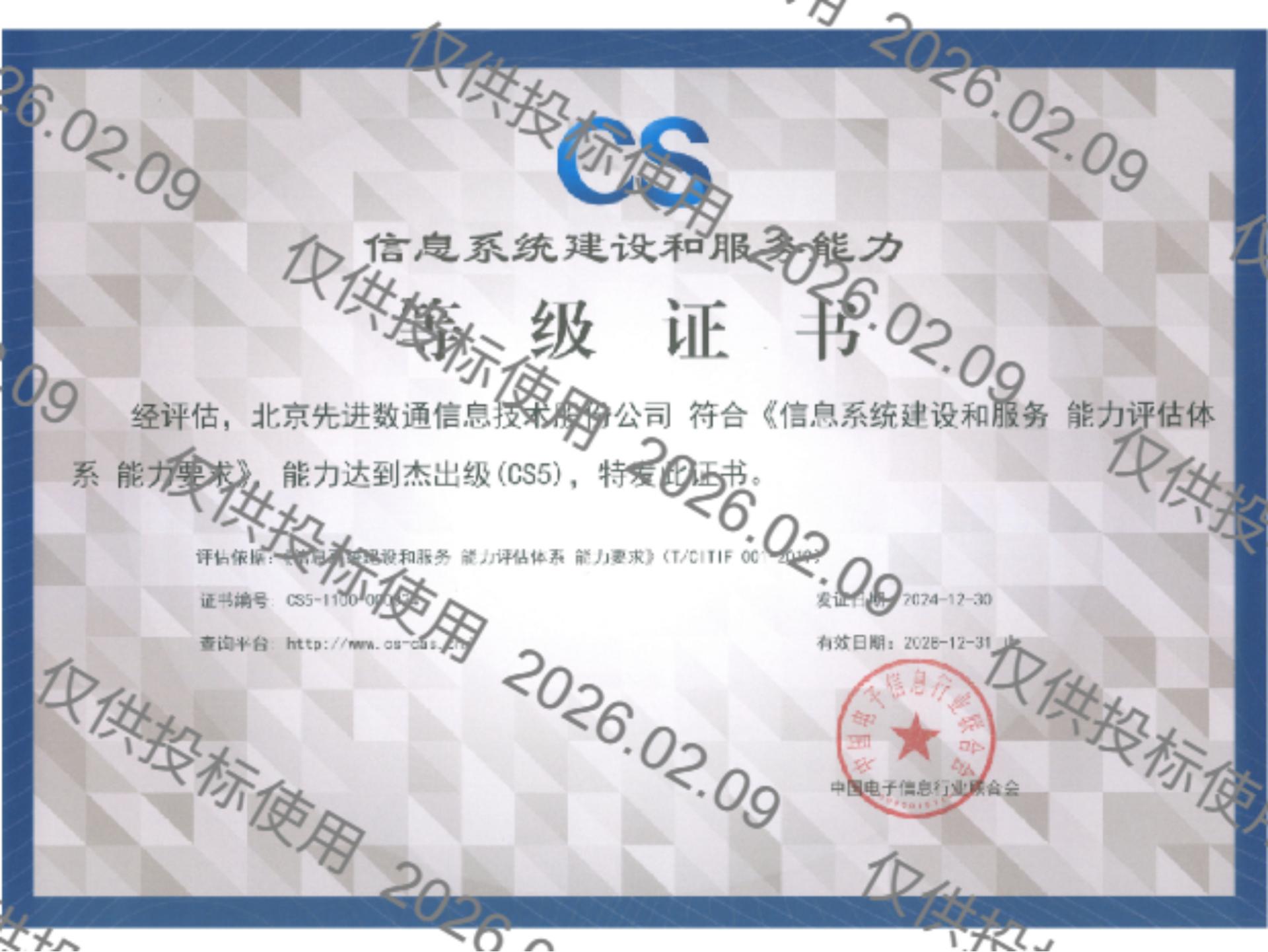 • 信息系统建设和效劳能力评估优异级(CS5)